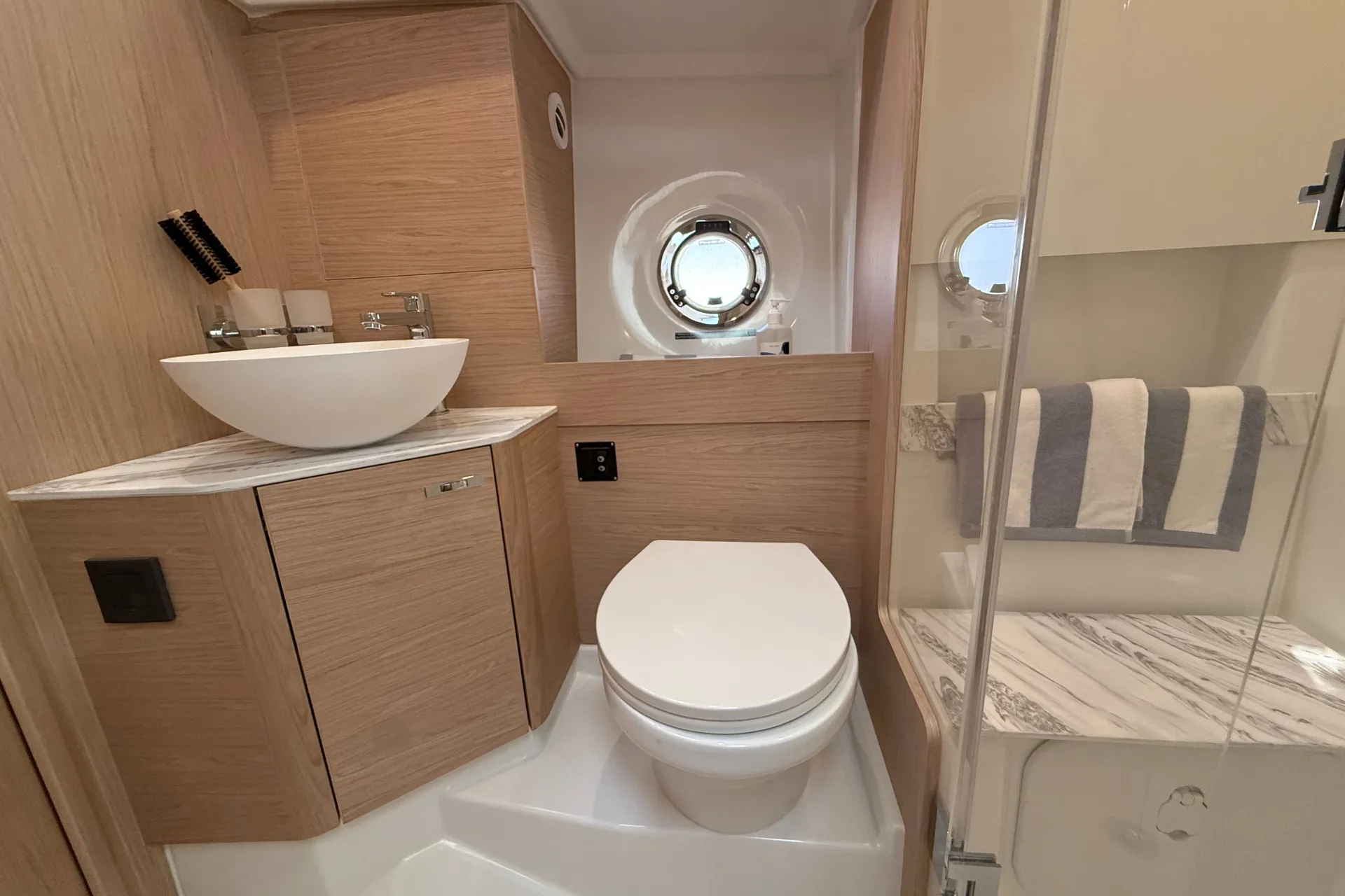 On-deck comfort & social spaces: The Flybridge offers elevated helm visibility plus lounge seating; on-deck sunbeds and a spacious cockpit give the whole family places to relax together or spread out.